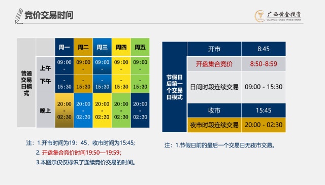 每周一至周五開市兩個時段(日間:09:00—15:30,夜間:20:00—次日02:30)連續交易,與國際黃金市場接軌,有效降低市場風險。晚盤時間交易活躍,適合上班族投資。