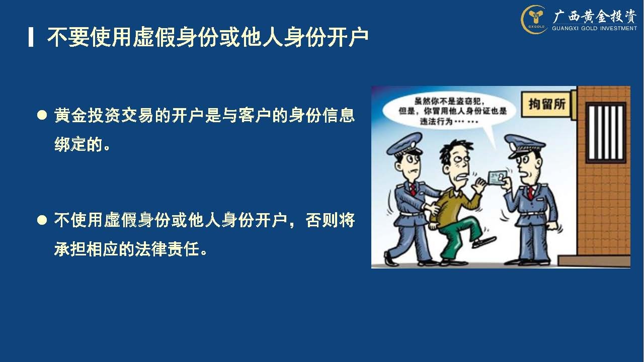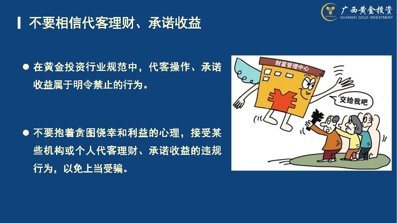 广西黄金投资仅授权合作机构推广和宣传指定的业务。合作机构仅是广西黄金投资指定业务的授权推广单位,不是广西结算中心或者广西黄金投资的会员或代理商。合作机构以自身名义开展的任何与广西黄金投资授权范围以外的业务和行为均与广西黄金投资无关,客户均应充分了解并识别评判其中风险,广西结算中心和广西黄金投资不承担由此引发的任何风险和法律责任。