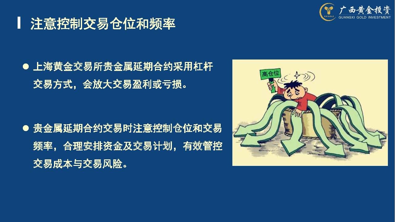 贵金属延期业务是一项高风险的投资,可能获得较高的收益,也可能发生大额损失。投资者在进入市场前,应充分了解贵金属市场的相关风险和交易产品的规则和特点。投资者应充分评估自身的风险承受能力,合理配置资产、不应用全部资金做投资,不应借钱来做投资,理性地进行贵金属投资。投资者不应听信市场上任何具有操作建议的资讯服务,须根据自身的真实意愿和理性判断独立进行投资或交易,并对自己的交易行为和结果负责。交易所导致的后果和责任均由投资者自行承担,我方不因此承担任何法律责任。